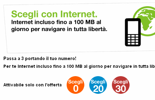 Tre ha attivato una nuova promozione commerciale rivolta agli utenti che richiederanno la portabilità del numero da altro operatore entro il 31 marzo 2012. L’iniziativa è stata denominata “Scegli con Internet” e consente di ottenere gratuitamente fino a 100 MB di traffico internet gratuito al giorno per navigare da smartphone. “Scegli con Internet” può essere richiesto in abbinamento con uno dei piani Scegli 0, Scegli 20 o Scegli 30.