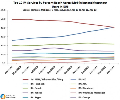 L’indagine scaturisce da una ricerca recente di ComScore Data Gem, che ha classificato gli strumenti di messaggistica istantanea più utilizzati tra Aprile del 2010 ed Aprile del 2011.