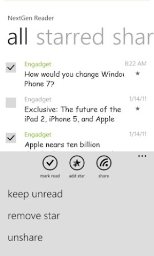 Ovviamente l’interfaccia utente è proprio quella in classico stile Microsoft Windows Phone 7, con la grafica relativa ai pulsanti touch a cui ci ha abituato il sistema operativo di Redmond e lo stesso utilizzo a sfioramento del display tattile. Sono presenti per la visualizzazione due temi, uno chiaro e l’altro scuro. Ovviamente ha anche il pieno supporto alle gestures di Windows. Il costo di NextGen Reader è di 0,99 euro ed è già uno dei client più scaricati.