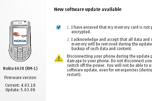 Come possiamo notare comparirà la versione del firmware presente sul nostro cellulare e quella disponibile. Selezioniamo la voce Update e diamo inizio al download e seguente installazione. Prima di effettuare ciò bisogna creare un file di backup del nostro nokia sul computer in modo tale da reinserire tutte quanti i nostri dati personali, rubriche, ecc. Tutti i dati, durante l’aggiornamento, saranno eliminati irreversibilmente.