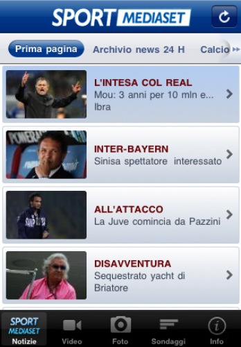 Per chi non sa vivere senza sport o per chi vuole avere la propria squadra del cuore sempre accanto, l’applicazione sembra fatta ad hoc. Attraverso Sport Mediaset si può venire aggiornati del calciomercato, sui risultati delle partite in tempo reale oppure vedere classifiche e posizioni della Formula 1 e del Moto GP. Inoltre tramite l’applicazione si può anche inviare le pagine agli amici tramite e-mail e condividerle sul social network preferito. Le notizie non sono solo testuali, sono corredate di foto e video in alta qualità.