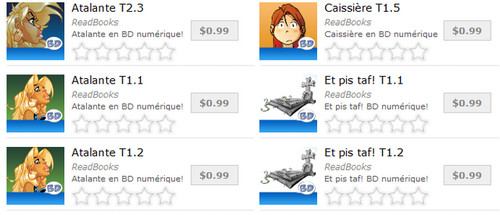 Nel mirino dei nostri colleghi americani sono finite le applicazioni che vedete ritratte qui sopra: sono circa 50 fumetti francesi praticamente identici fra loro che – suggerirebbe il semplice buonsenso – andrebbero raggruppati in un’unica app e non conteggiati come singole app. Insomma, è un po’ come scrivere una guida su come aprire i PDF e pubblicarla sul MarketPlace di Microsoft sotto forma di applicazioni relative a paragrafetti di due righe l’una.