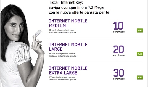 Quella di Tiscali vuole essere un’offerta chiara, intuitiva e trasparente così da mettere a disposizione dei propri clienti tre semplici profili tariffari in abbonamento in grado di soddisfare le esigenze di tutti. I piani in abbonamento si chiamano Tiscali Internet Mobile Medium, Large o Extra Large e costano rispettivamente a 10, 20 o 30 euro al mese a seconda delle ore di navigazione incluse nell’offerta.