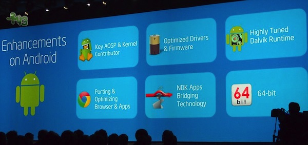 Attenendosi infatti ad un’immagine (annessa anche all’inizio di questo post) catturata durante il recente IDF 2013 tra i vari miglioramenti che Android porterà con sé figura anche il supporto ai chip a 64 bit.