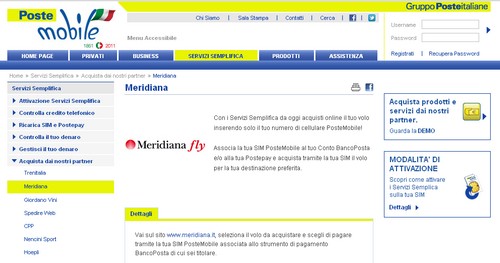 PosteMobile amplia l’offerta di servizi a disposizione dei propri clienti. L’operatore mobile virtuale del gruppo Poste Italiane ha infatti annunciato la sigla di un accordo con la compagnia aerea Meridiana Fly che permetterà ai possessori di una SIM PosteMobile di acquistare biglietti aerei direttamente attraverso il proprio cellulare. Il servizio sarà a disposizione di tutti i clienti PosteMobile che abbiano deciso di abbinare la propria SIM ad uno strumento di pagamento Banco Posta (Conto Corrente o carta prepagata PostePay).