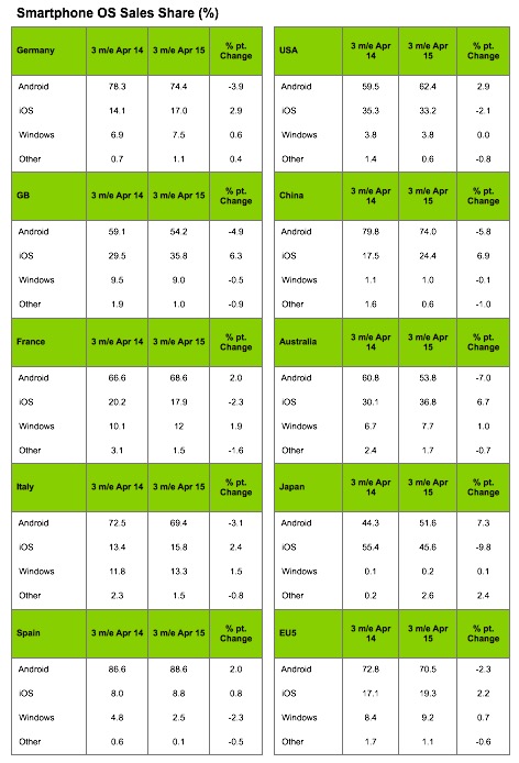 Sono interessanti i dati emersi in riferimento al mercato smartphone alla fine del mese di aprile 2015, in riferimento ai tre mesi precedenti, con cui possiamo notare un leggero calo di Android a favore di iOS.