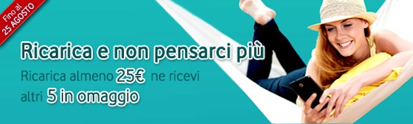 La mini promozione lanciata da Vodafone prevede che sino al 25 agosto tutti coloro che effettueranno una ricarica online della propria SIM di almeno 25 euro riceveranno un bonus omaggio di 5 euro.