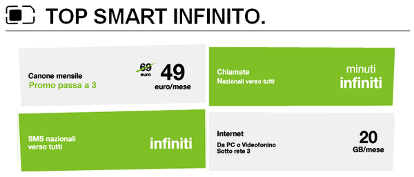 Segnaliamo infine che per i piani TOP 3000 è previsto il passaggio automatico ai nuovi e più favorevoli piani TOP Infinito. Per tutti i dettagli è possibile consultare il sito di 3 Italia: Piani TOP SIM, piani TOP Smart e piani TOP Special.