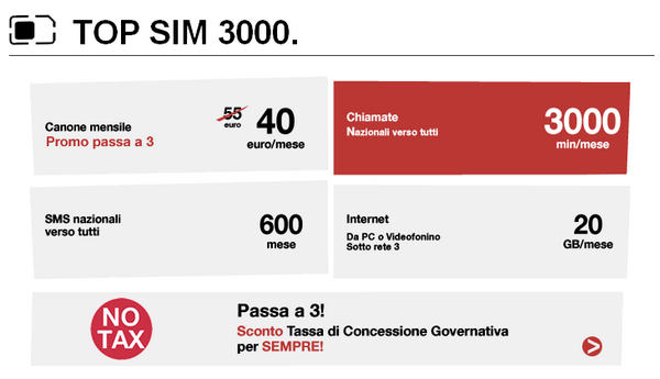 Come si può notare lo sconto per chi passa a 3 è particolarmente conveniente e raggiunge una punta massima del 60% sul piano TOP SIM 400. In aggiunta a ciò sui piani TOP SIM 800, TOP SIM 1600 e TOP SIM 3000 è possibile usufruire anche della speciale Promo No-Tax che rimborsa per sempre l’equivalente della Tassa di Concessione Governativa (5,16 euro al mese per le utenze personali). Ricordiamo infine che i piani TOP SIM prevedono soglie settimanali per chiamate ed SMS pari ad un quarto della soglia mensile. Tutti le informazioni per attivare la nuova promozione sui piani TOP SIM sono disponibili sul sito Tre.it.