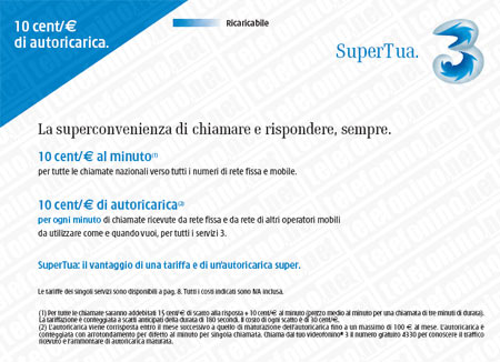 Come già avvenuto in passato, alcuni clienti di TRE in queste ultime ore hanno ricevuto una comunicazione interessante. La loro linea è stata nuovamente promozionata con la scomparsa (e rimpianta) tariffa SuperTua+ di 3Italia. La promozione, nel messaggio ricevuto dai fortunati clienti di 3, viene ancora definita come Speciale 2008 e prevede ancora i 4 centesimi di euro di autoricarica per ogni SMS/MMS/VMS ricevuto da altro operatore mobile nazionale diverso da 3 o da operatore nazionale di rete fissa.