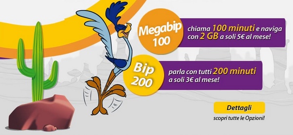 - Megabip 200 aggiunge a sua volta 500 MB a settimana di traffico Internet a quanto previsto da Bip 200. In promozione per tutto il 2013 l’opzione ha un costo di 6 euro al mese mentre da gennaio 2014 il costo diventerà di 8 euro al mese.