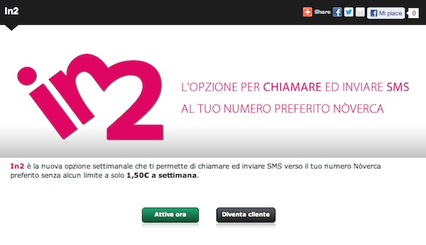 Nòverca ha lanciato una nuova opzione settimanale denominata In2. Con In2 è possibile chiamare ed inviare SMS verso un numero Nòverca preferito a 1,50 euro/settimana senza limiti di alcun genere.
