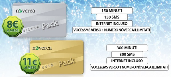 - Nòverca Silver Pack: Prevede un costo di 8 euro al mese; Include 150 minuti di chiamate verso tutti, 150 SMS verso tutti e l’accesso ad Internet. In più sono compresi chiamate e messaggi illimitati verso un altro numero Nòverca.
