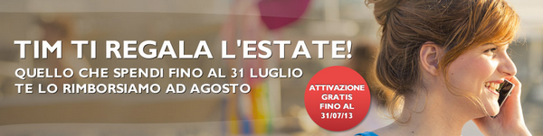 Estate con TIM è una promozione completamente gratuita che può essere attivata fino al prossimo 31 luglio 2013. Per come è strutturata l’iniziativa i vantaggi per gli utenti sono tanto maggiori quanto più tempestiva è l’attivazione della promozione stessa. TIM infatti restituirà nel mese di agosto quanto speso fino al 31 luglio con il proprio credito residuo per chiamare, inviare messaggi, navigare in Internet e per gli eventuali costi di rinnovo settimanali o mensili delle offerte attive sul proprio numero.