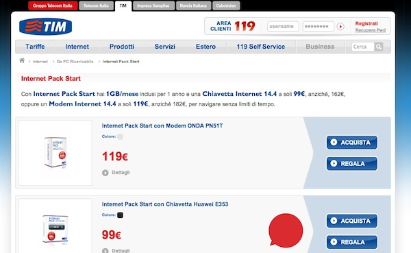 TIM Internet Pack Start comprende navigazione Internet per un anno a 1 GB/mese più una chiavetta Internet a scelta fra Huawei E353 ed Onda TM201 a 99 euro (anziché 162 euro) oppure Modem ONDA PN51T 14.4 più navigazione Internet senza limiti a 119 euro anziché 182 euro.