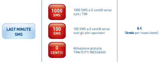 Il costo di attivazione di Last Minute SMS, pari a 6 euro, sarà gratuito per chi attiva l’opzione presso un negozio TIM contemporaneamente all’attivazione di una nuova linea TIM o all’ingresso nel mondo TIM da altro operatore dopo la conclusione della pratica di portabilità del numero.
