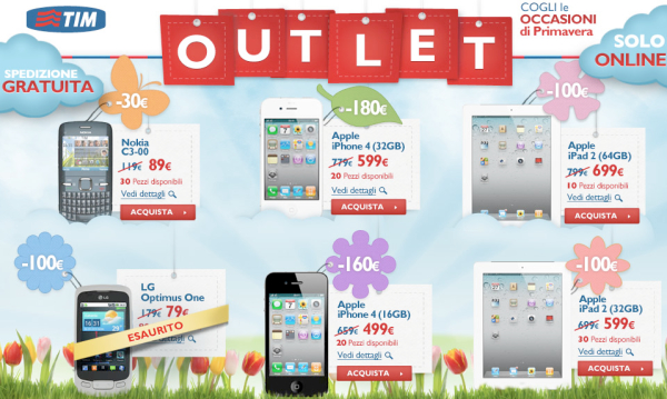 In occasione della Pasqua TIM lancia una serie di offerte primaverili davvero interessanti, smartphone e tablet in vendita a prezzi scontati, solo online e solo fino ad esaurimento scorte. Nel momento in cui scrivo ad esempio LG Optimus One è terminato, mentre sono ancora disponibili il Nokia C3-00, l’iPhone 4 e l’iPad 2 in vari tagli di memoria.
