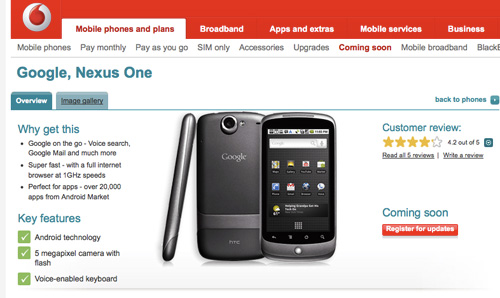 Sul sito di Vodafone UK già è apparsa la pagina web in anteprima che pubblicizza il Nexus One. Purtroppo ancora non si sanno date certe per la distribuzione, ma da quello che si è capiti siamo davvero vicini. Nuovi rumors parlano del 23 Marzo come data d’uscita, ma per ora non si sa ancora niente di certo.