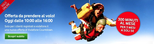 Incredibile offerta Vodafone, solo online e solamente fino alle 16:00 di oggi, martedì 15 maggio. Il gestore offre 300 minuti al mese (verso numeri fissi e mobili Vodafone) per 90 giorni al prezzo di 5 euro. Avete capito bene, 900 minuti per 90 giorni, al prezzo di 5 euro una tantum, una volta scaduti i tre mesi non sarà più possibile rinnovare la promozione.