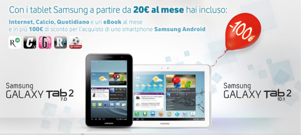 Vodafone lancia una interessante promozione, fino al 31 luglio con l’acquisto di un tablet Samsung Galaxy Tab 2 7.0 o 10.1 riceverete un buono sconto di 100 euro per comprare uno smartphone Samsung Galaxy sul Vodafone eShop.