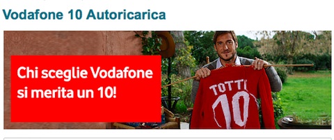 È arrivata Vodafone 10 Autoricarica, la tariffa per chiamare e mandare SMS a tutti i numeri in Italia a 10 cent e che in piu’ permette di ricaricarsi con le chiamate effettuate. In occasione del lancio del nuovo piano tariffario, Vodafone torna in TV con Francesco Totti. Protagonista dello spot il numero dieci, come il numero della maglia del famoso calciatore che racconta i momenti importanti della sua vita, proprio segnati dal numero 10.
