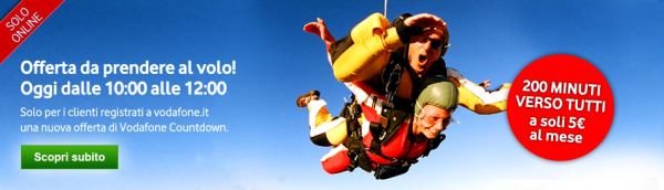 Solo oggi su Vodafone.it trovate una nuova straordinaria offerta, valida dalle 10:00 alle 12:00. Il gestore offre 200 minuti/mese verso tutti a soli 5 euro al mese, una promozione da non lasciarsi scappare per nessun motivo, visto che risulta, a conti fatti, estremamente vantaggiosa.