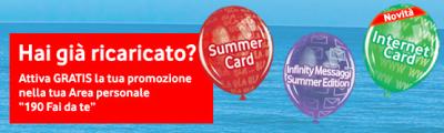 C’è, poi, una terza possibilità: chi opterà per una ricarica online del valore di 50 euro potrà avere gratuitamente tutto il pacchetto estivo offerto da Vodafone, ovvero Summer Card, Infinity Messaggi Summer Edition e Internet Card. Chi ha già effettuato una delle due ricariche utili per l’attivazione gratuita delle promozioni potrà entrare nella propria sezione Fai Da Te del sito www.vodafone.it e troverà nelle sezioni delle suddette opzioni il pulsante “Gratis Per Te”. Basterà cliccarci su per poter usufruire dei vantaggi offerti dalle promozioni.