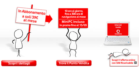 Navigare con il nuovo Samsung NC10 Internet Inside è semplicissimo: è sufficiente inserire la propria sim dati all’interno del modem, cliccare sull’icona di connessione e accedere cosi al mondo Internet in maniera facile e veloce. Per soddisfare le esigenze di navigazione di tutti i propri clienti Vodafone offre Samsung NC10 Internet Inside insieme ad un’ampia offerta di traffico dati. Tutti i clienti privati che sottoscriveranno l’offerta entro il 15 maggio, potranno acquistare l’esclusivo Vodafone MiniPc e utilizzarlo per navigare ben 10 ore al giorno, fino a 300 ore al mese, a 39 euro mensili per 24 mesi.
