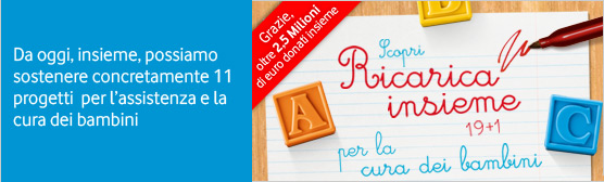 Ma come funziona? Effettuando una ricarica telefonica da 20€ via Ricarica Insieme riceverete 19€ di traffico sulla vostra SIM e 1€ andrà a sostenere uno di questi 11 progetti di assistenza e cura dei bambini.