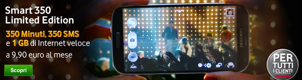 L’attivazione di Smart 350 Limited Edition è gratuita per i nuovi clienti mentre prevede un costo di 19 euro per chi è già cliente Vodafone. Per le nuove attivazione è inoltre prevista l’abilitazione del piano Vodafone 12 con chiamate nazionali a 12 cent/min (più 18 cent alla riposta) ed SMS nazionali a 12 cent. Smart 350 Limited Edition si rinnova automaticamente ogni 30 giorni salvo disattivazione.