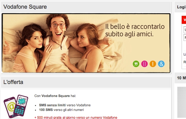 Vodafone ha lanciato una nuova promozione dedicata ai nuovi clienti. Chi passa a Vodafone entro il 31 agosto può usufruire di uno sconto di due anni sul canone mensile di Vodafone Square, la nota offerta che permette di avere SMS illimitati verso numeri Vodafone, 500 minuti gratis al giorno verso un numero Vodafone e 100 SMS gratis verso altri operatori.