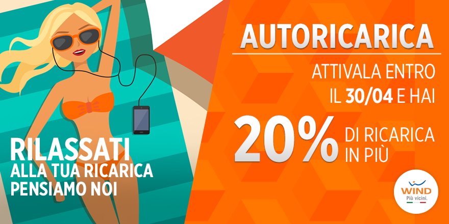 “Partecipa alla promozione Attiva Autoricarica, non rimanere più senza credito! Attiva gratuitamente il servizio Autoricarica dal 18 al 30 aprile e avrai +20% di ricarica in omaggio per tutte le ricariche automatiche ricevute dal 18/04 al 31/05.