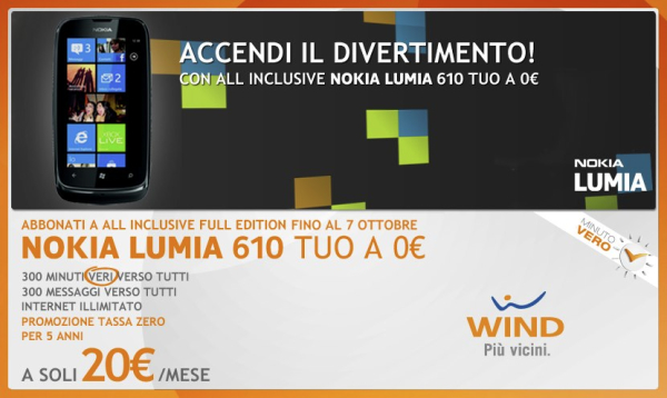 Wind presenta la nuova offerta All Inclusive che include 300 minuti verso tutti, 300 messaggi verso tutti, navigazione illimitata in rete a soli 20 euro al mese per cinque anni, con tassa di concessione governativa inclusa nel prezzo. Inoltre il Nokia Lumia 610 è incluso a costo zero, davvero una bella offerta, la quota mensile è molto contenuta ed il telefono è in regalo.