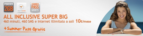 Da notare che i 460 minuti inclusi in All Inclusive Super Big sono senza scatto alla risposta e vengono scalati per ogni secondo consumato. In caso di superamento delle soglie voce e SMS verranno applicati i costi del proprio piano tariffario di base. Qualore invece venisse superato il limite mensile di traffico dati, la connessione non verrà bloccata e non si pagherà nessun extra ma la velocità calerà sino a 32 Kbit sino al mese successivo.