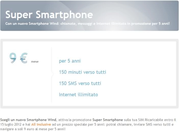 Wind lancia Super Smartphone, promozione dedicata a tutti coloro che acquistano un nuovo smartphone Wind entro il 15 luglio 2012. Super Smartphone offre 150 minuti verso tutti, 150 SMS (verso tutti) e navigazione internet illimitata a 9 euro al mese per cinque anni.