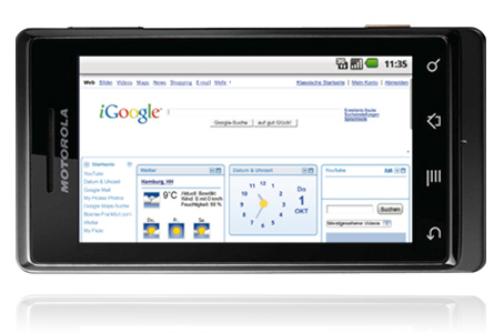 Comprende tutte le applicazioni di Google (Google Maps with Latitude, Google Talk, Google Mail, YouTube), supporta la sincronizzazione dei contatti con Microsoft Office e dispone di un modulo GPS in grado di trasformare il telefono in un navigatore ricco di funzioni. Il browser Web pre-installato è dotato del supporto per lo standard HTML5 e la tecnologia Flash 10.