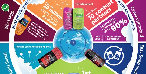 Il successo della famiglia Asha è stato sintetizzato in una infografica pubblicata su Nokia Conversations che riassume tappe e cifre fondamentali di questa famiglia di terminali. Nokia Maps è uno dei servizi di maggiore successo tra quelli disponibili sui modelli Asha ed offre un livello di copertura impressionante: 190 paesi, 45,5 milioni di km di strade e 75 milioni di punti di interesse. Strategico è anche il ruolo del nuovo Nokia Browser, l’interfaccia di accesso al web che è arrivata a registrare fino a 4 nuovi utenti per ogni secondo.