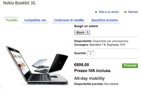 Da ieri su Nokia Online Shop e nei Nokia Store è possibile prenotare il nuovissimo Nokia Booklet 3G ed essere così sicuri di essere tra i primi a ricevere direttamente a casa propria il primo mini-laptop prodotto dall’azienda finlandese. Il Nokia Booklet 3G porta con sé nel mondo dei PC tutta l’esperienza di Nokia nella mobilità e il suo prezzo di vendita è di 699 euro. Un prezzo che non deve spaventare: non ci troviamo davanti al solito smartphone evoluto che viene venduto ad una cifra improponibile: il Nokia Booklet 3G è un vero e proprio computer portatile a partire dal sistema operativo, ovvero Windows 7.