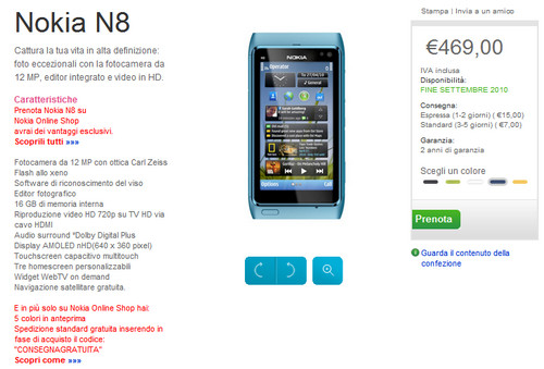 L’attesa è finita. Il sito ufficiale italiano di Nokia ha dato il via alle prenotazioni del Nokia N8. Il prezzo di vendita al pubblico è pari a 469 euro, mentre la disponibilità del terminale è fissata per “fine settembre 2010”.
