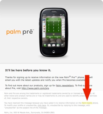 Tra le note della mail in questione spicca la seguente frase: “You have received this message because you have opted to receive information on the Castle phone”. Possibile che Palm si sia scordata di ricontrollare il messaggio prima di essere inviato? Beh, a quanto pare è cosi, e vedono vedono tale errore come un qualcosa di molto simile a quanto accaduto per il BlackBerry Storm, chiamato anche Thunder in alcuni siti e in diversi comunicati di Research In Motion tanto da far pensare addirittura a due versioni dello stesso modello.