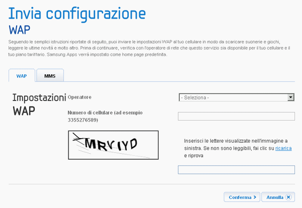 Per queste esigenze Samsung mette a disposizione un comodo servizio online che consente in pochi passaggi di riconfigurare il proprio Galaxy S3 o qualsiasi altro smartphone della casa coreana compatibile con questi servizi. Per configurare l’accesso ad Internet basta collegarsi a questa pagina e selezionare il pulsante ‘VAI A IMPOSTAZIONI WAP‘.