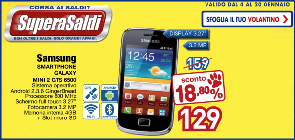Iniziano i saldi anche per il mondo della telefonia mobile. Fino al 20 gennaio Euronics propone in offerta il Samsung Galaxy Mini 2 al prezzo di 129 euro invece di 159, con un risparmio di ben 30 euro sul prezzo di acquisto originale. La promozione è valida sia nei negozi sia sul sito per gli acquisti online, in questo caso il prezzo è di 140 euro, spese di spedizione incluse.