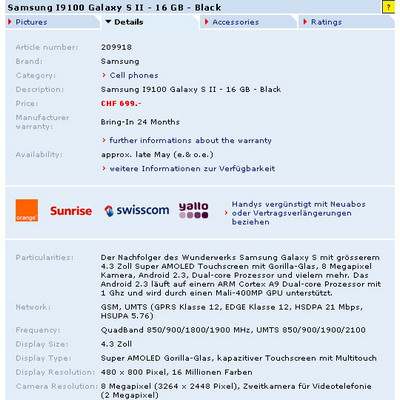 Il rivenditore svizzero Digitec ha pubblicato una scheda del Samsung Galaxy S II in cui vengono svelate la data di debutto e il prezzo del nuovo super-smartphone presentato al Mobile World Congress di Barcellona.