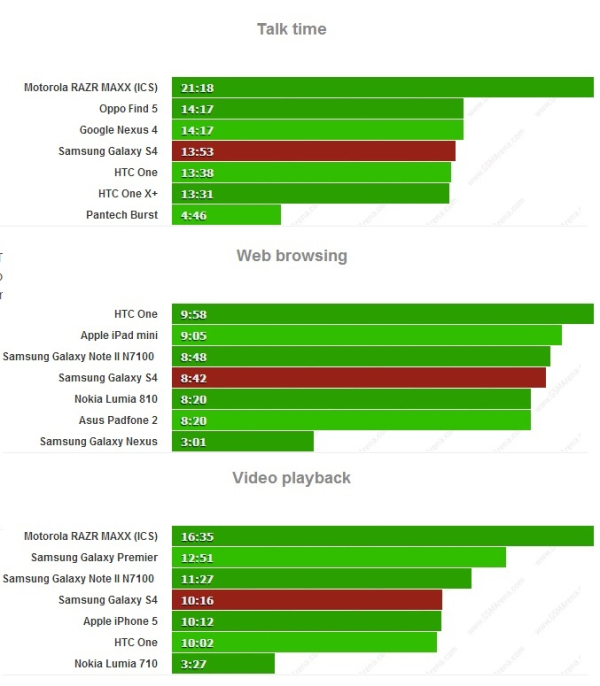 GSMArena ha messo a dura prova la batteria del Samsung Galaxy S4 ed ha ottenuto risultati decisamente interessanti. La durata della batteria del nuovo nato in casa Samsung si è dimostrata superiore a quella di smartphone come HTC One, Galaxy S3 e S2, solo il Galaxy Note II ha una duratadella batteria leggermente superiore.