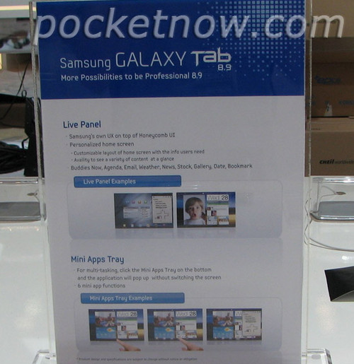 Come testimonia il cartellone pubblicitario immortalato nelle foto che trovate a corredo del post, il nuovo Samsung Galaxy Tab 8.9 avrà un display da 8.9 pollici (1280×800 pixel), un processore dual-core e uno spettacolare rapporto peso-dimensioni che lo vede misurare appena 8.6mm di spessore (0.2mm meno di iPad 2) e pesare non oltre 470 grammi.
