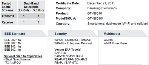 Per ora non c’è niente di ufficiale ma in Rete è apparso un certificato di interoperabilità WI-Fi che parla del Samsung GT-N8010, un terminale ancora molto misterioso, dual-band (2.4GHz / 5.0GHz) e con connettività Wi-Fi 802.11 a/b/g/n, che secondo i bene informati potrebbe essere proprio il successore del Galaxy Note.