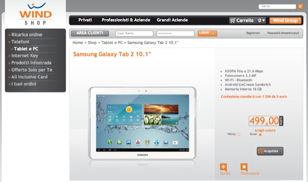 Wind è il primo operatore mobile italiano a mettere in vendita il nuovo e atteso Samsung Galaxy Tab 2 10.1. Questo tablet viene venduto al prezzo di 499€, e attivando la promozione Super Smartphone entro il 10 giugno 2012 avrete Internet No Stop a metà prezzo: tutto il meglio del web a solo 4,5€ al mese per i primi 2 anni.