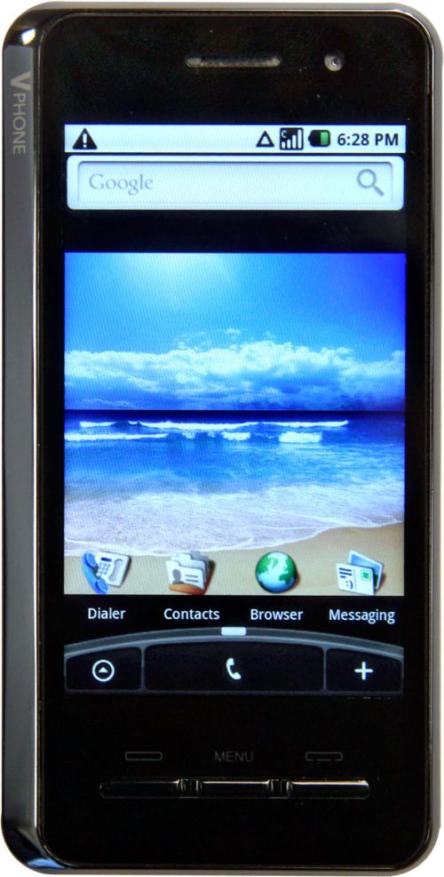 Passando alla “ciccia”, lo schermo del VPhone V1 è di tipo capacitativo, è ampio 3.5 pollici ed ha una risoluzione pari a 800×480 pixel. Ottimi la fotocamera integrata, da 5.0 Megapixel con autofocus e flash, ed il processore, che è potente 624 MHz. Da segnalare anche la presenza di una fotocamera VGA frontale, che però potrebbe essere rimossa all’ultimo memento.