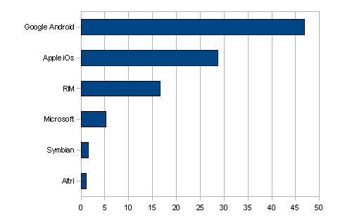 In ascesa risulta anche la diffusione del sistema operativo iOS di Apple che beneficia del recente lancio dell’iPhone 4S e conquista il 28,7% del mercato. Rispetto ad agosto la quota della casa di Cupertino è aumentata di 1,4 punti percentuali. Nel raffronto con i dati di ottobre l’incremento è stato invece pari a 0,7 punti. Tra agosto e novembre il differenziale tra le quote di mercato di Android ed iOs è passato da 16,5 a 18,2 punti percentuali.