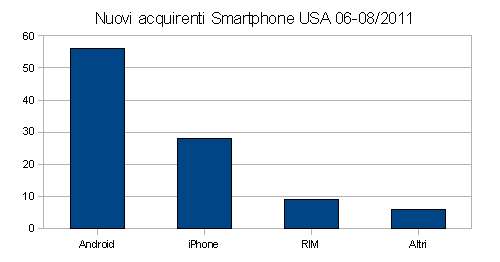 Per certi versi ancora più interessanti sono i dati relativi alle vendite degli ultimi tre mesi (da giugno ad agosto 2011). Queste cifre sono indicative degli spostamenti del mercato e costituiscono quindi una proiezione sulle evoluzioni future. Anche in questo caso Android si conferma in forte ascesa avendo conquisto il 56% dei nuovi acquirenti con un guadagno di 7 punti percentuali rispetto al 49% dei tre mesi precedenti. Anche nell’analisi trimestrale Apple conferma la solidità del proprio mercato con una quota che resta fissa al 28%.